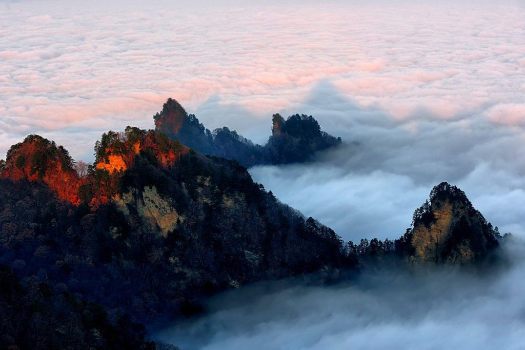 Wudang Mountain features numerous scenic wonders, including 72 peaks, 36 cliffs, 24 gorges, 11 caves, 3 pools, 9 springs, 10 ponds, 9 wells, 10 rock formations, and 9 terraces. Centered around Tianzhu Peak, the scenic area boasts perilous paths like the Upper and Lower Eighteen Bends, as well as iconic landscapes such as “Seventy-Two Peaks Bowing to the Main Summit” and “Golden Hall Overlapping Shadows.” The most famous palaces and temples include: Golden Summit, Taihe Palace, Nanyan Palace, Zixiao Palace, Fuzhen Temple, Qiongtai Temple, and Wulong(Five Dragon) Palace.