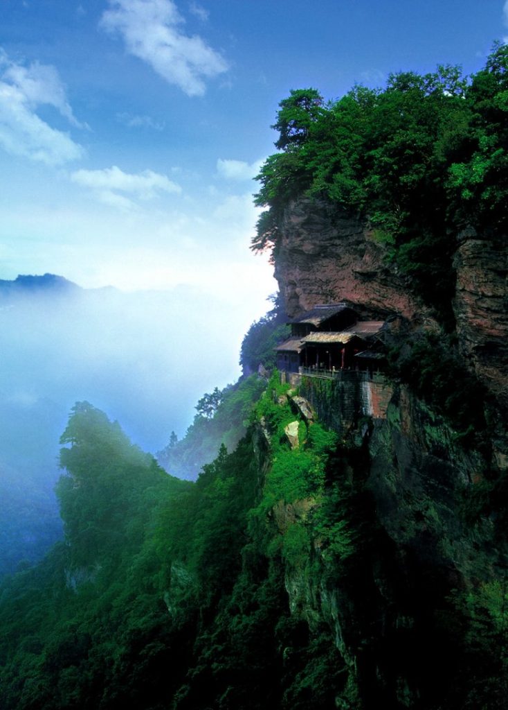 Nanyan stands out among Wudang Mountain’s 36 cliffs for its scenery. Located beneath Duyang Cliff, the mountain range soars like a wing hanging from the sky, renowned for its beautiful peaks and ridges. Its peaks are steep and precipitous, covered with lush forests, reaching up to the blue sky and overlooking a deep gorge. Nanyan faces the peaks of Tianzhu to the south, overlooks Wulong Ancestral Temple to the north, is flanked by Zhanqi Peak to the east and Feishen Platform (Ascension Platform) to the west, connecting to white clouds and blue sky above and overlooking a thousand-zhang deep gorge below. It is a famous landscape described as “Its might engulfs Tai and Hua mountains, close to the Milky Way; its grandeur overpowers Min and E mountains, towering above Yulei Peak.” As one of the four major geological relic parks of Wudang Mountain National Geopark, Nanyan’s natural landscape and human architecture (Nanyan Palace) are organically integrated.